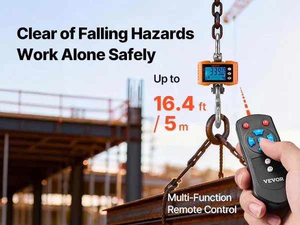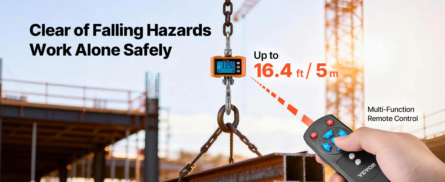 16.4 ft Remote: This hanging scale includes an IR remote that operates most functions up to 16.4 ft. You point and click to stay clear of swaying loads and tight spots while keeping full control