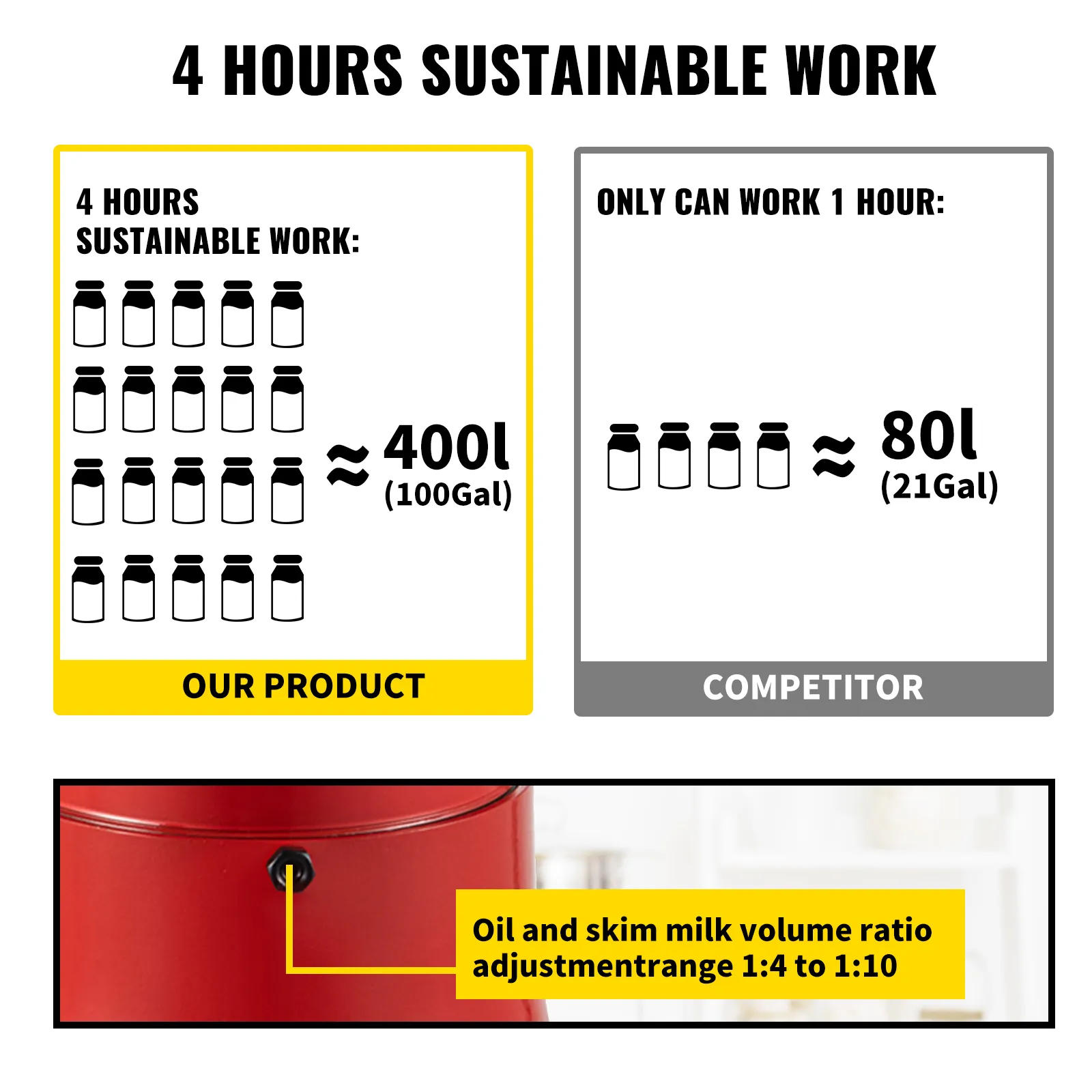 The advantage of this milk fat separator is that the machine can sustainably work for 4 hours, making it has much more output than other milk separators. Output: 50~100L/12.5-25Gal per hour.
