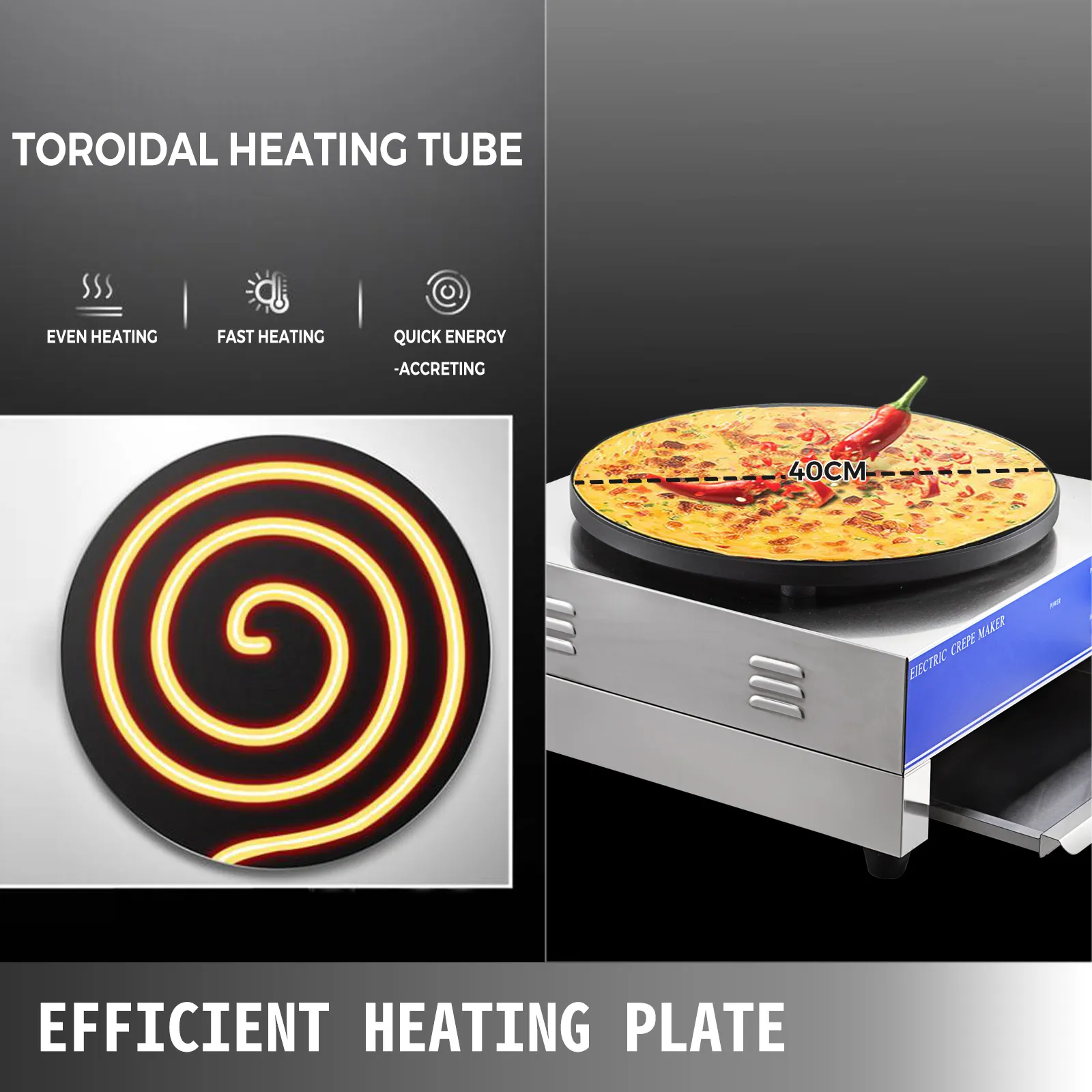 • 【15.7-INCH HEATING PLATE】- The large 15.7-inch (40cm) heating plate with built-in toroidal heating tubes helps distribute even heating, so crepes are uniformly cooked, featuring 3kW high power output for instant heating.