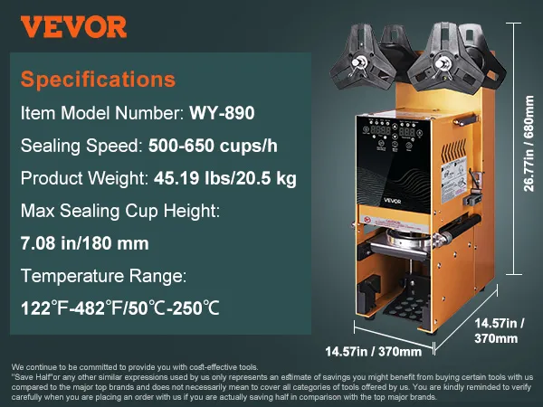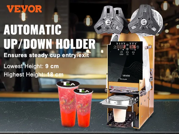 VEVOR Fully Automatic Cup Sealing Machine, 500-650 Cups/H, Cup Sealer Machine for 180 mm Tall & 90/95 mm Cup, Electric Boba Tea Sealer with Digital Control LCD Panel for Bubble Milk Tea Coffee, Gold