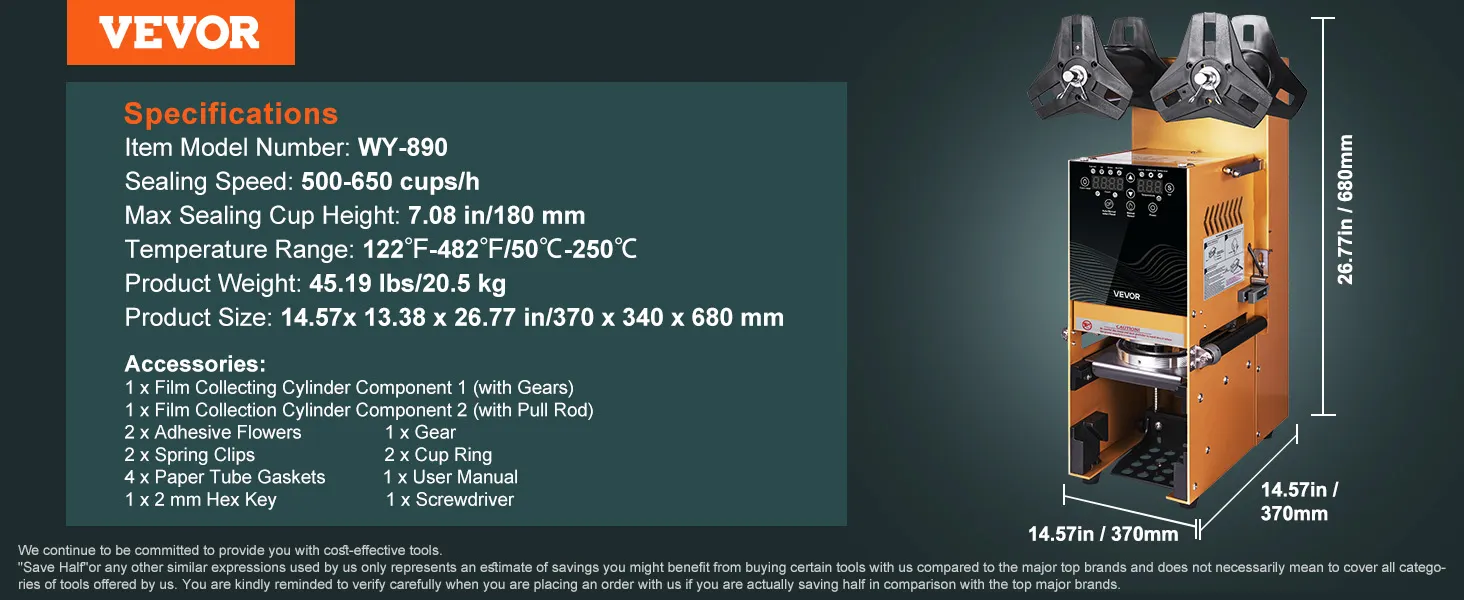Compatible with 90/95 mm Cups: Our cup sealing machine is compatible with cups ranging from 90 mm to 180 mm in height and 90/95 mm in diameter. Whether they are made of PP/PE/PS materials or paper/plastic cups, this sealer can easily handle them.