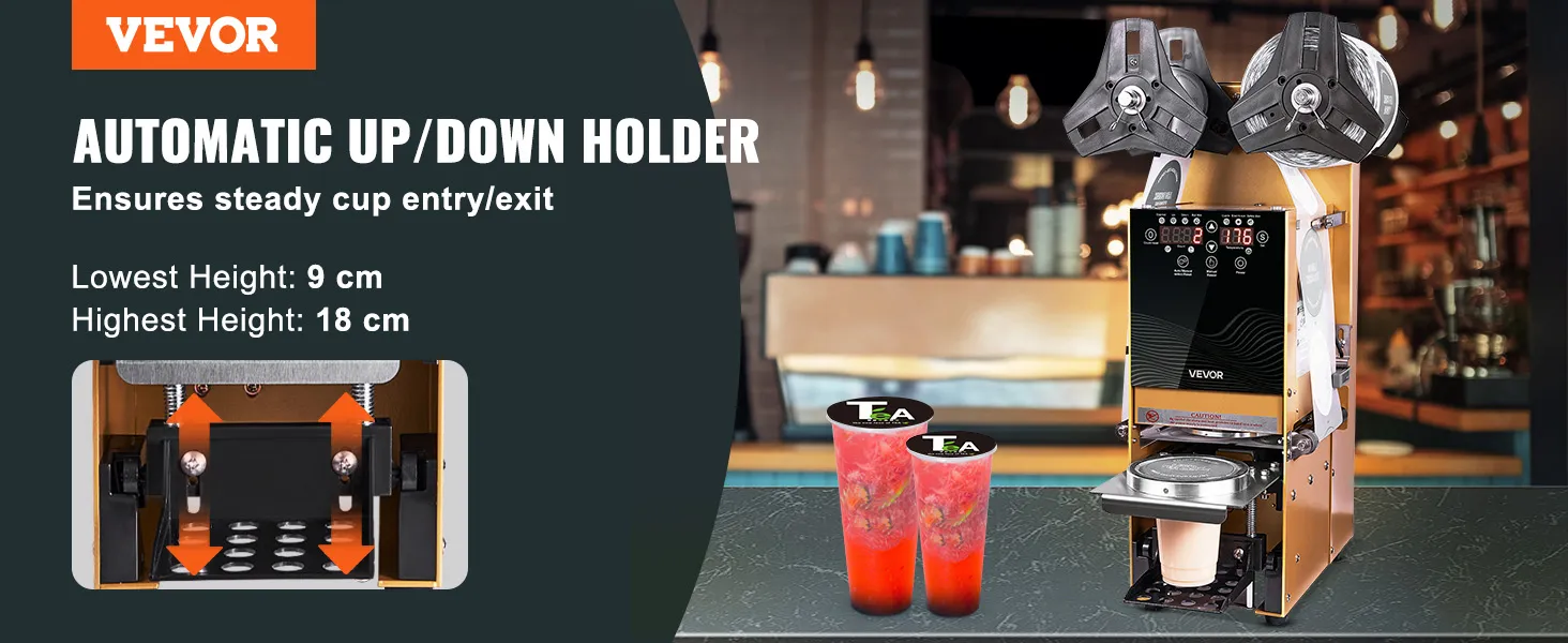 No more hassle with different cup sizes! Our cup sealing machine comes with an automatic lifting cup holder that smoothly handles cups ranging from 9 to 18 cm in height.
