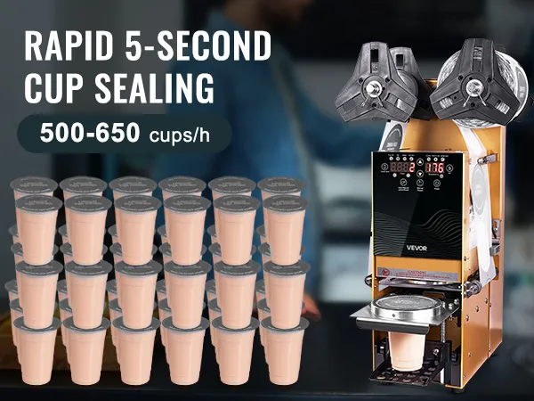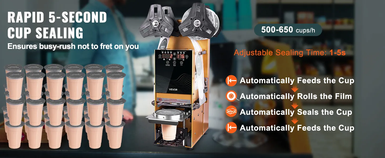 Our cup sealer machine can seal cups within 5 seconds, handling everything from cup feeding to film rolling, sealing, and cup ejection automatically. With a capacity of 500-650 cups per hour, it effortlessly handles high customer traffic.