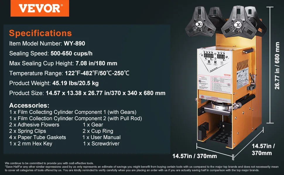 Compatible with 90/95 mm Cups: Our cup sealing machine is compatible with cups ranging from 90 mm to 180 mm in height and 90/95 mm in diameter. Whether they are made of PP/PE/PS materials or paper/plastic cups, this sealer can easily handle them.