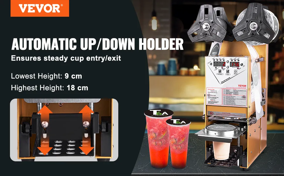 No more hassle with different cup sizes! Our cup sealing machine comes with an automatic lifting cup holder that smoothly handles cups ranging from 9 to 18 cm in height.