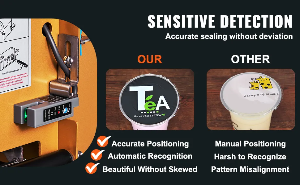 Say goodbye to wonky seals! Our automatic cup sealing machine uses smart electronic eye technology to make sure every seal is spot on, without any manual guesswork. It's all about that neat, professional finish.