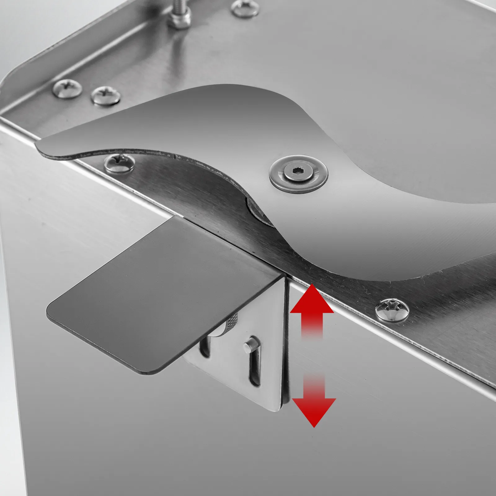 Remove the housing of the sausage slicer, and you can see a plate. The slices' thickness can be easily adjusted by moving it up/ down, 5 mm - 35 mm adjustable.