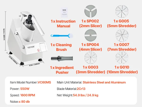6 Versatile Blades: This multi-functional food processor comes equipped with 6 sharp blades made from durable 2Cr13 stainless steel. It includes two slicing blades (2mm and 4mm) and four shredding blades (3mm, 5mm, 7mm, and 10mm), allowing you to process a variety of vegetables, fruits, and other ingredients to suit your needs.
