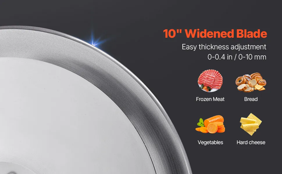 Upgraded 10" Blade: Our meat slicer is equipped with an upgraded 10" wider blade, effortlessly handling various food textures such as frozen meat, cheese, and bread. You can keep it sharp with the built-in blade sharpener.