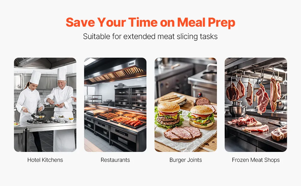 Our deli meat slicer adapts to a variety of countertops, serving smoothly in hotel kitchens, restaurants, burger joints, and frozen meat shops.