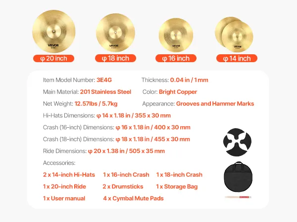 This cymbal set includes 4 cymbals: a 14-inch Hi-Hat, a 16-inch Crash, an 18-inch Crash, and a 20-inch Ride. Plus, 2 drumsticks, 1 storage bag, and 6 silent pads. Bright tones, a variety of styles, and durability make it great for beginners!