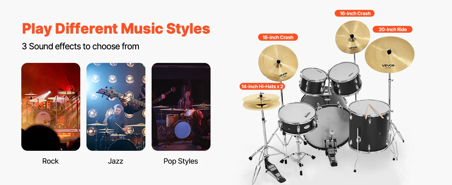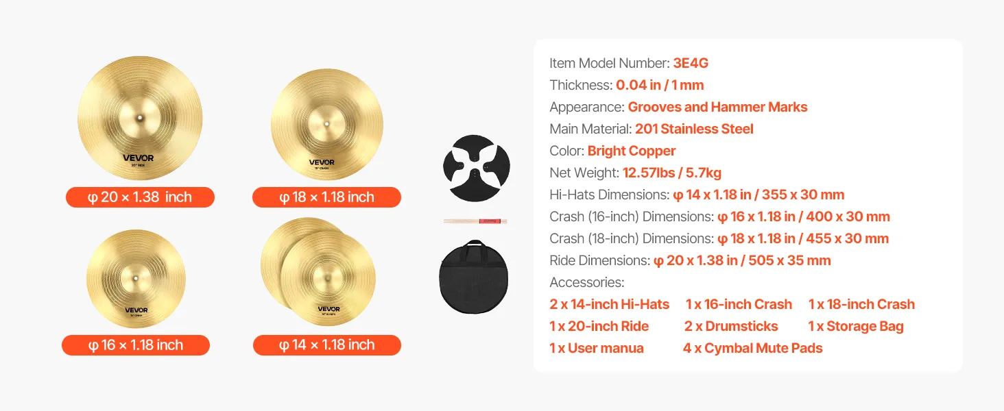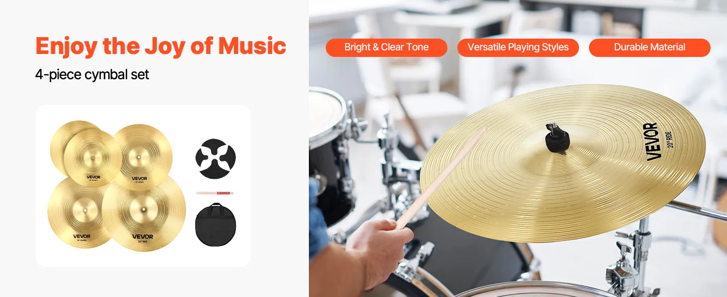 Multi-piece Cymbal Set: This cymbal set includes 14-inch Hi-Hats, 16-inch Crash, 18-inch Crash, and 20-inch Ride, providing versatile sounds for all your musical needs. Ideal for jazz, rock, or pop, it suits every style