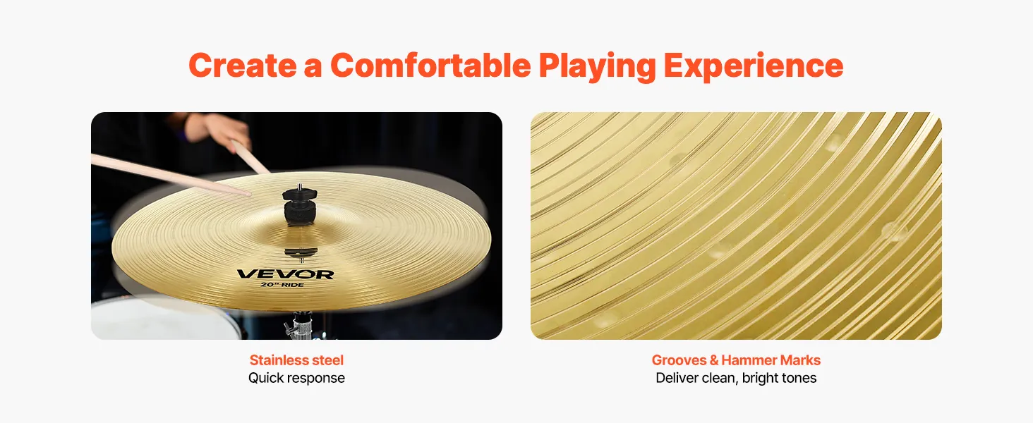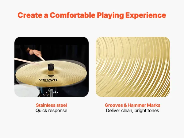 Crafted from durable alloy, our drum cymbals set are 1 mm thick for quick response while staying strong. The grooves and hammering ensure a clean, bright tone, giving you a smooth, enjoyable playing experience.