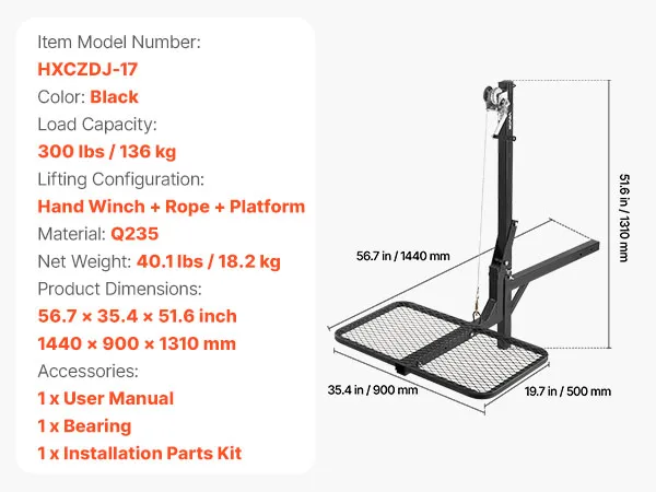 Easy Lifting: This manual hitch deer hoist features a hand crank winch, rope, and platform, enabling easy lifting of heavy game even in remote, power-less areas