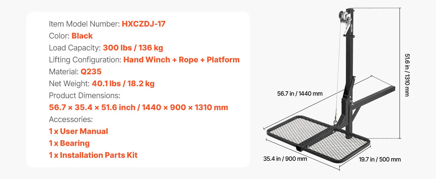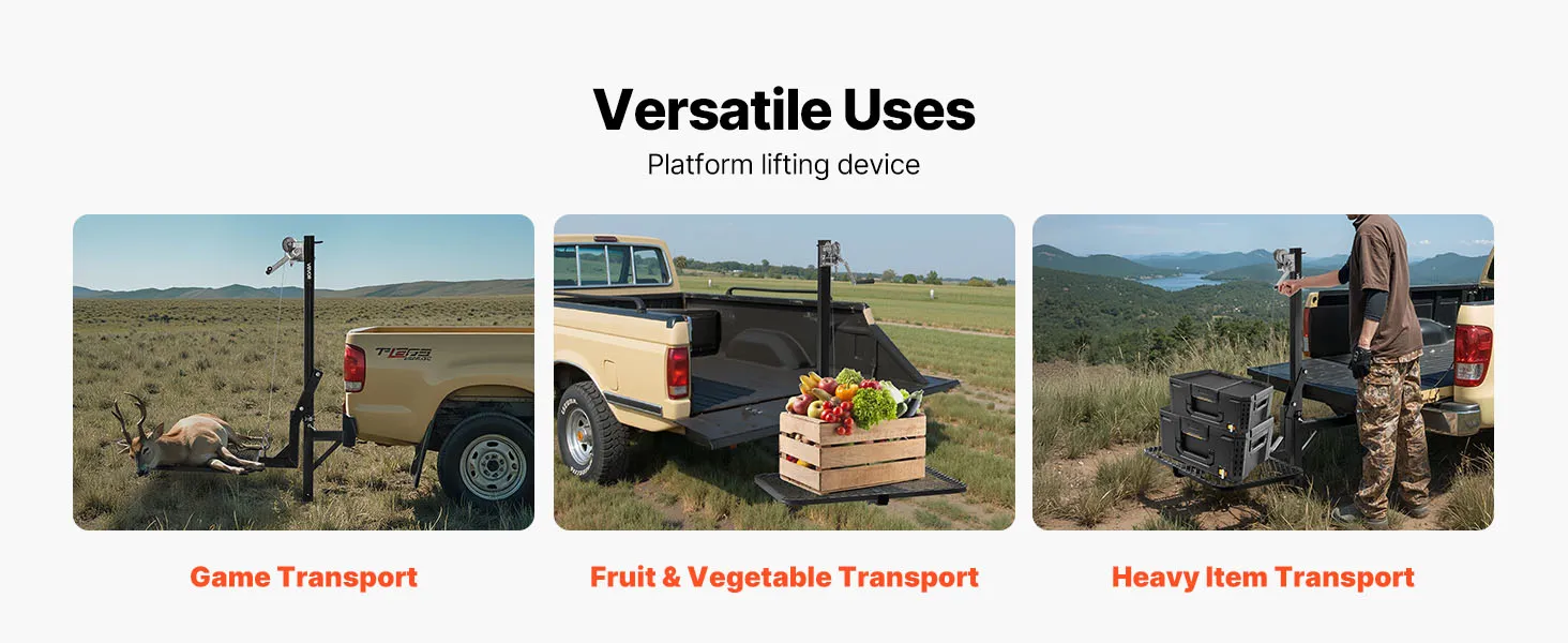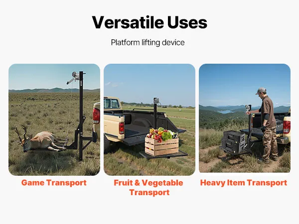 Versatile Use: Our hunting game hoist is equipped with a 2-inch truck hitch, compatible with various truck types. Ideal for outdoor hunting, farm animal lifting, fruit/vegetable transport, or lifting heavy items outdoors