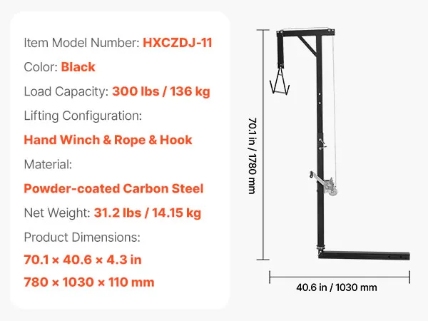 This manual game hoist offers stable support, lifting up to 300 lbs of game. Made of durable Q235 carbon steel, with a rust-resistant coating, it's ideal for outdoor hunting, farm work, and lifting heavy items, even in areas without electricity. Easy to clean and maintain.