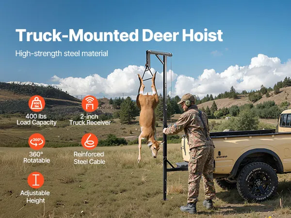 Versatile Use: Our hunting game hoist is equipped with a 2-inch truck hitch, compatible with various vehicle types. Ideal for outdoor hunting, farm animal lifting, fruit/vegetable transport, or lifting heavy items outdoors