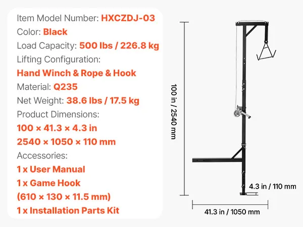 • Easy Lifting: This manual hitch deer hoist features a hand crank winch, rope, and hook, enabling easy lifting of heavy game even in remote, power-less areas