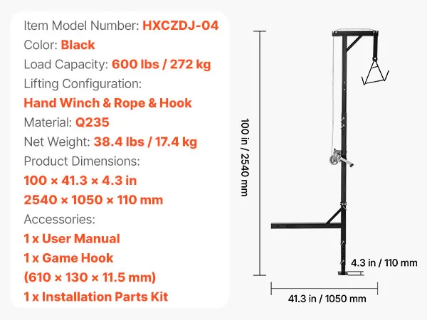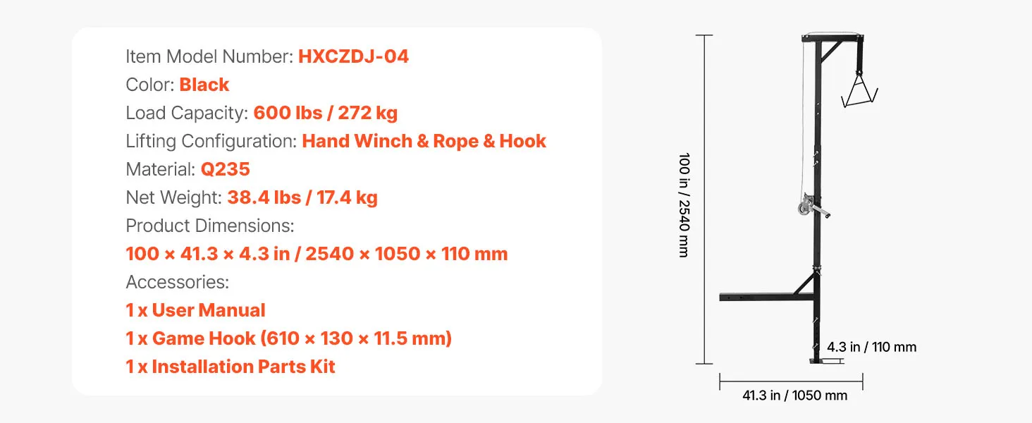 • Easy Lifting: This manual hitch deer hoist features a hand crank winch, rope, and hook, enabling easy lifting of heavy game even in remote, power-less areas