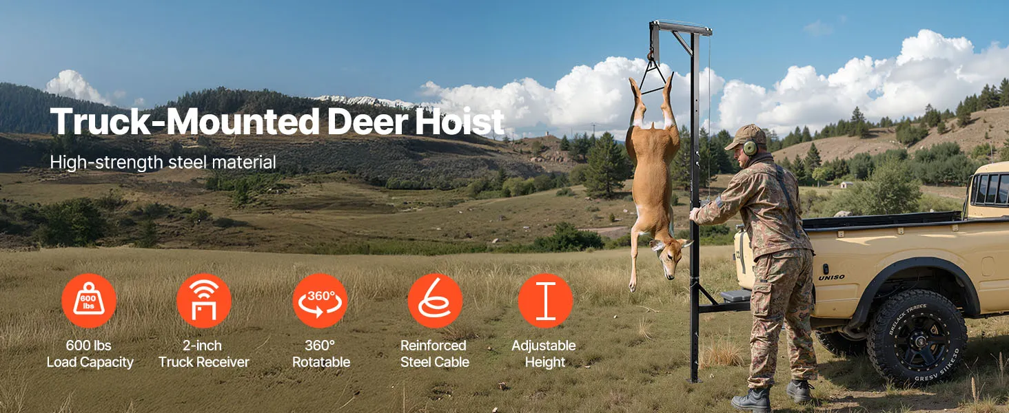 VEVOR Truck Hitch Game Hoist, 600 lbs Load Capacity, Hunting Deer Hoist with 2-inch Receiver, 360-Degree Swivel Shaft & Adjustable Height, Includes Gambrel Winch for Skinning & Cleaning Game VEVOR Truck Hitch Game Hoist, 600 lbs Load Capacity, Hunting Deer Hoist with 2-inch Receiver, 360-Degree Swivel Shaft & Adjustable Height, Includes Gambrel Winch for Skinning & Cleaning Game
