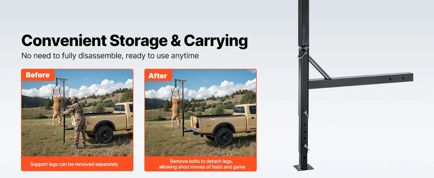 The truck hitch game hoist can be conveniently stored by folding the support legs when not in use, with no need for complete disassembly. No reinstallation is needed for the next use.