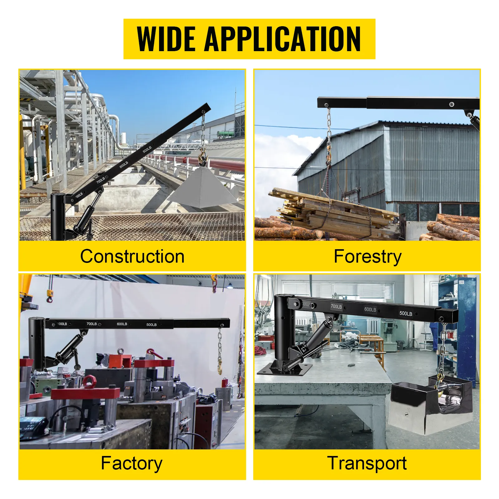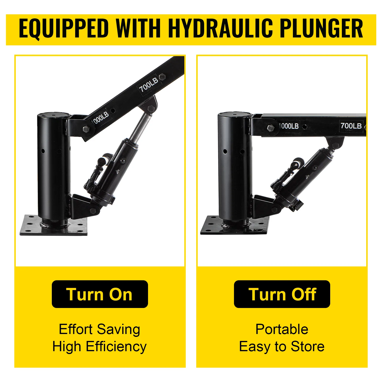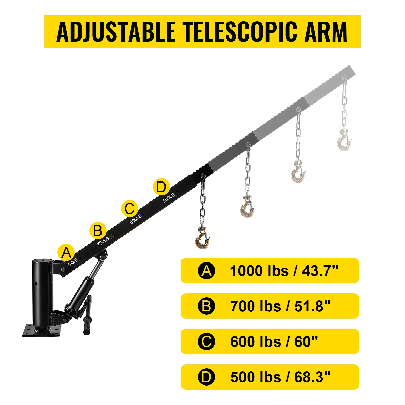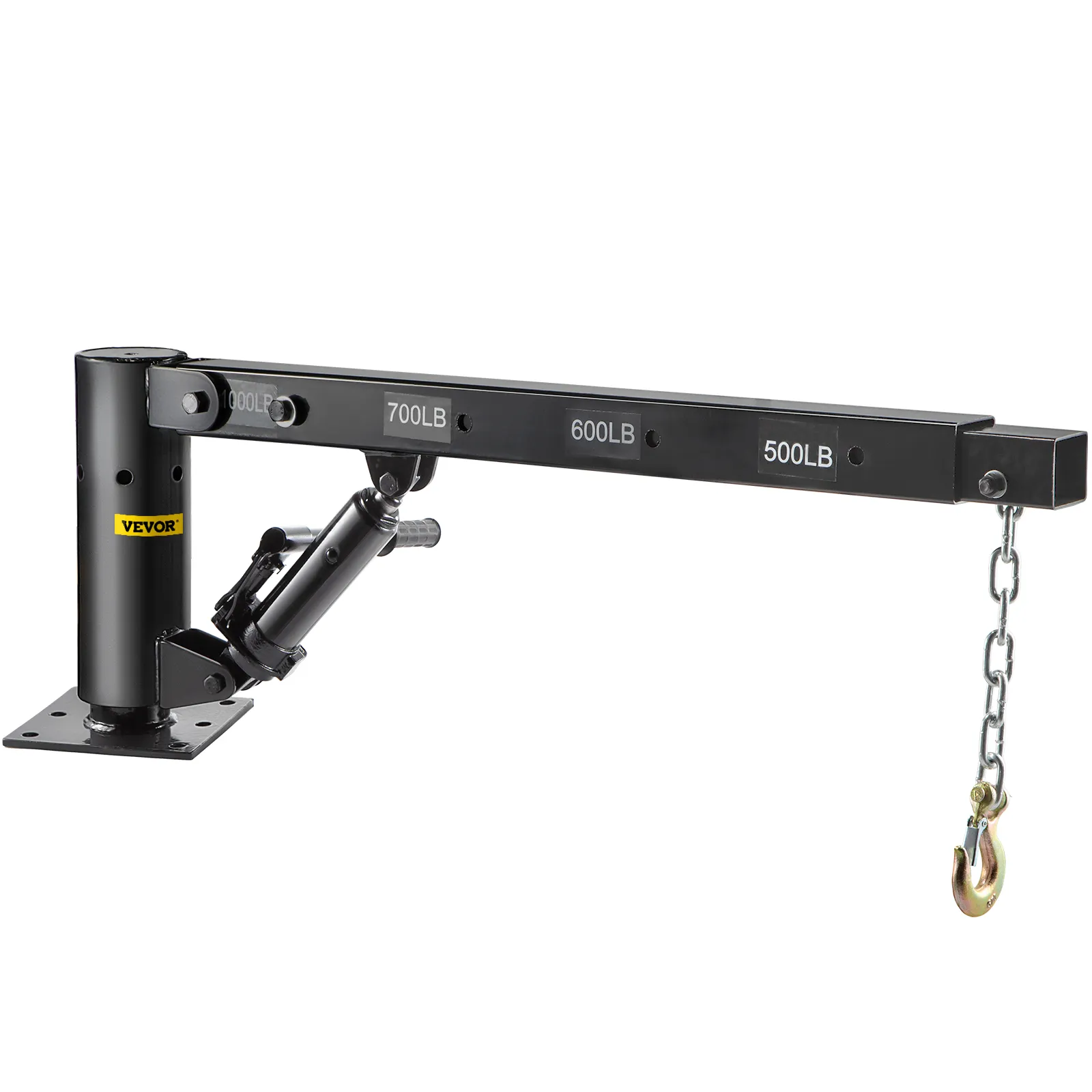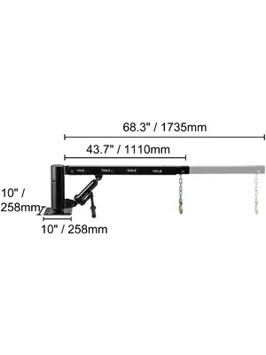 The telescopic arms of the davit crane lock in 4 positions (1000lbs, 700lbs, 600lbs, 500lbs) extend from 44" to 68". The height of the hydraulic plunger raises to 78.7". The base of the crane is designed to rotate 360° and the rugged construction ensures long-term durability. A pickup truck crane is equipped with a 16" hydraulic plunger for easy attachment to the cargo, and truck cranes allow one person to lift the engine quickly.