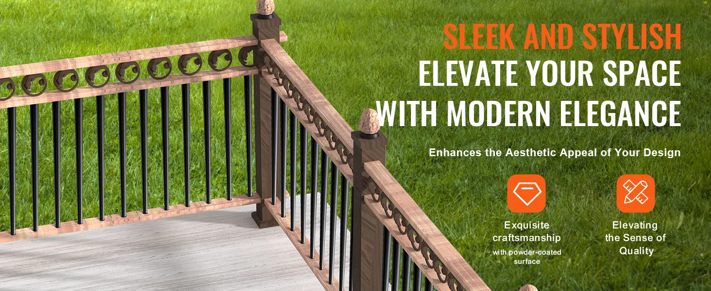The satin black powder-coated finish on the VEVOR staircase metal balusters gives them an elegant look. The finish is also weather-resistant. This means that the baffles will maintain their look for a long time. The powdercoated finish protects the balusters from rust and corrosion. It ensures they last longer and require less maintenance. You can add these elegantly finished balusters to any deck or porch. They add an upscale touch of sophistication to your outdoor space.