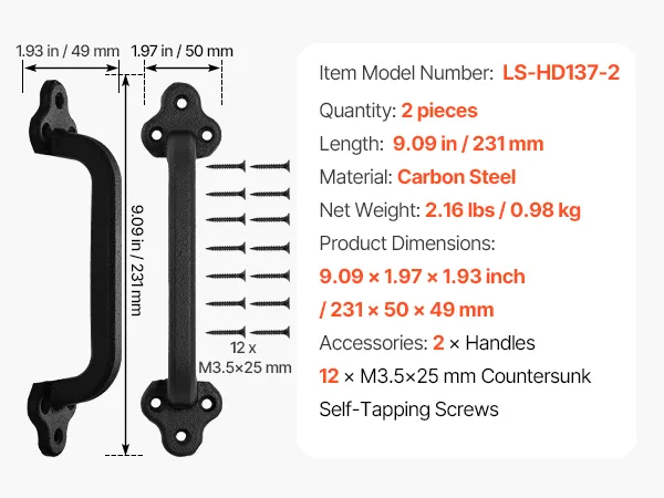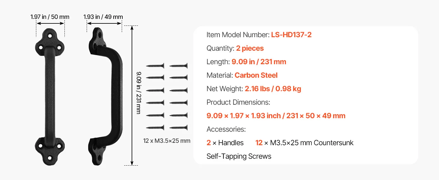 VEVOR Barn Door Handle, 2Pcs 231 mm Rustic Fence Gate Handle, Rust-Resistant Coating, Heavy Duty Carbon Steel Outdoor Gate Handles, Easy to Install, Metal Sliding Door Pulls for Garage Shed Closet