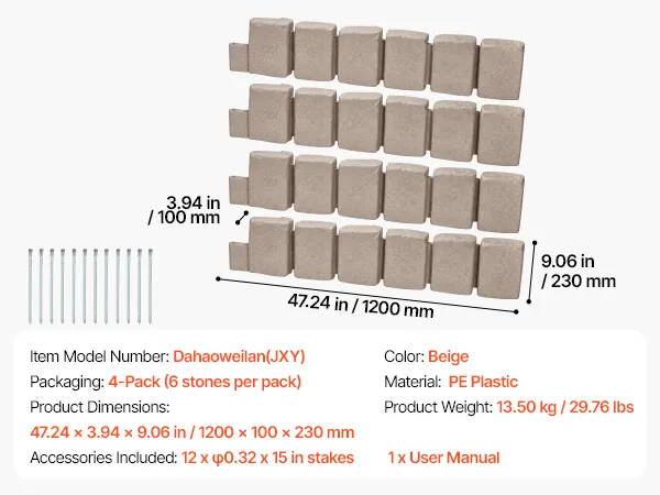 Realistic Stone Texture: Our stone landscape edgings feature a lifelike stone texture design. The raised surface patterns add depth and dimension to your outdoor spaces. Each piece measures 1200x100x230mm/47.24x3.94x9.06in), making them perfect for enhancing pool edges, garden beds, and pathways. These lawn edging provide a clean, refined look for both large and small spaces.