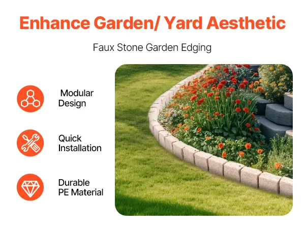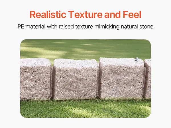 This stone landscape edging features a lifelike stone texture that effortlessly enhances the visual appeal of your garden, pool, pathways. The modular design allows for quick installation. Made from quality PE, this lawn edging is fade-resistant, rust-resistant, lightweight, and long-lasting.