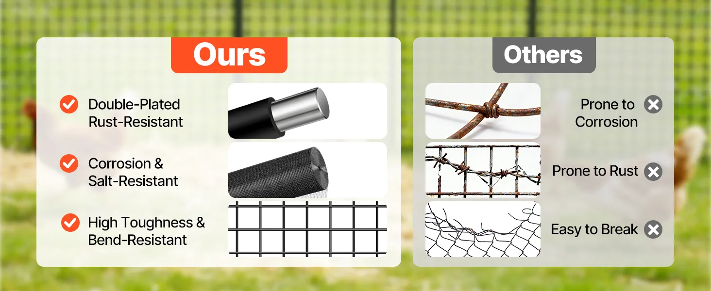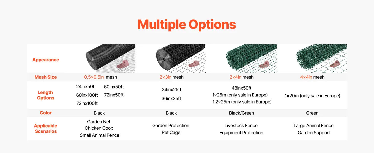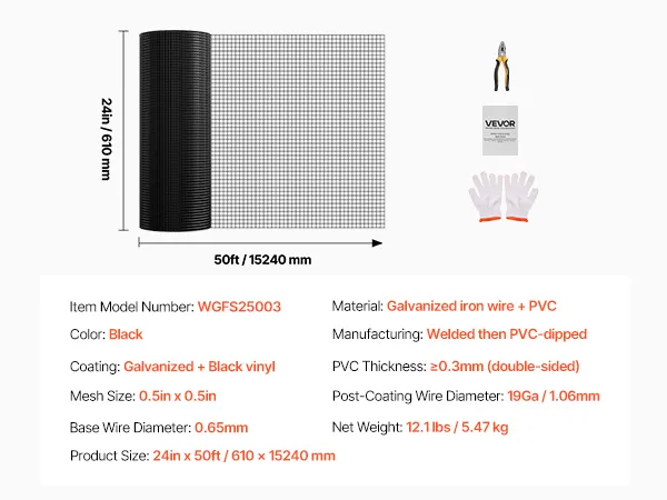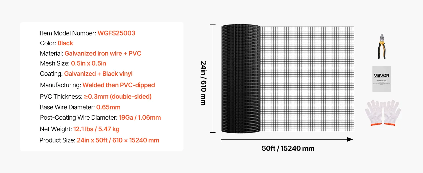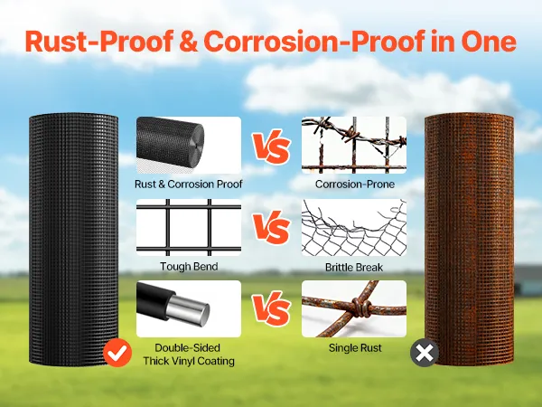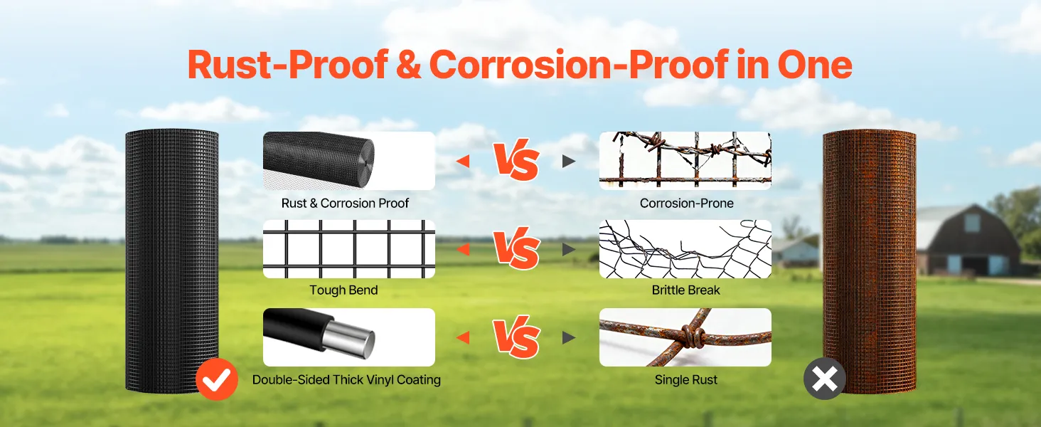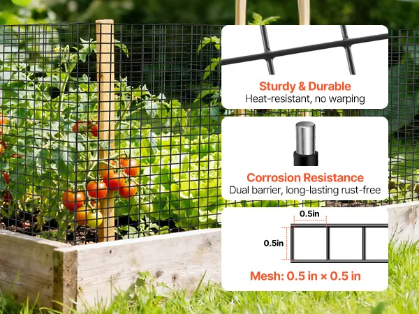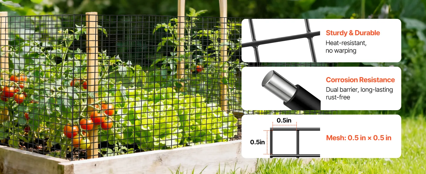 Premium Coating: Heavy-duty galvanized steel wire with black vinyl coating for double rust protection. Enhanced weather resistance keeps the mesh hardware cloth durable against sun, rain, and seasonal wear for long-lasting performance