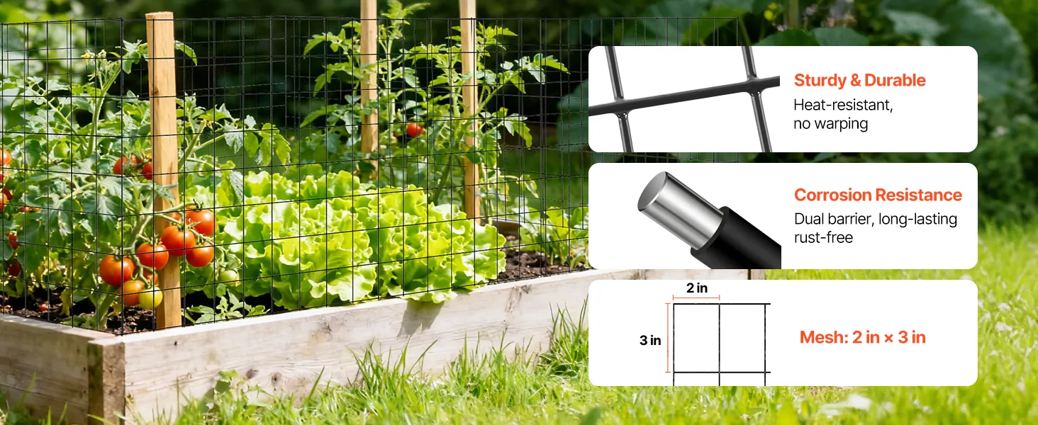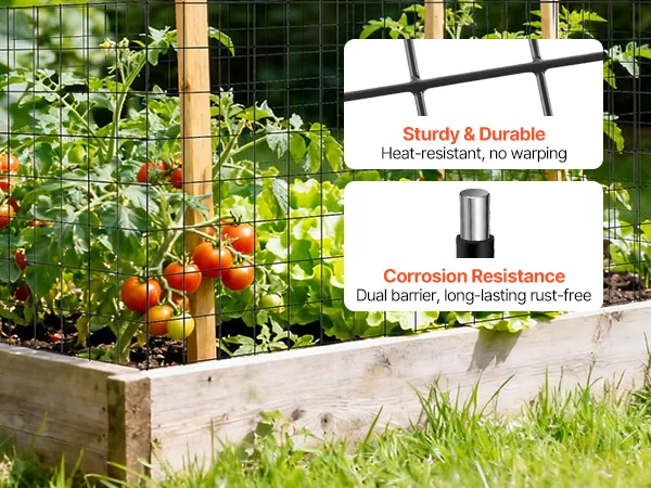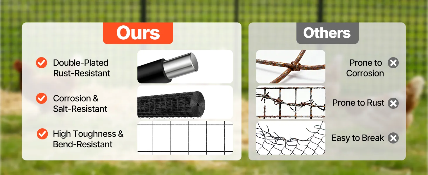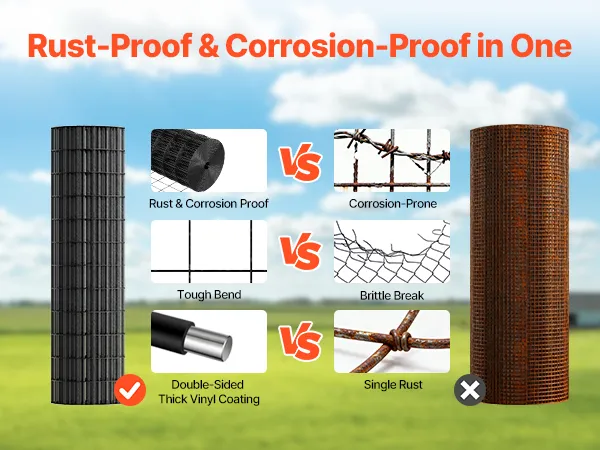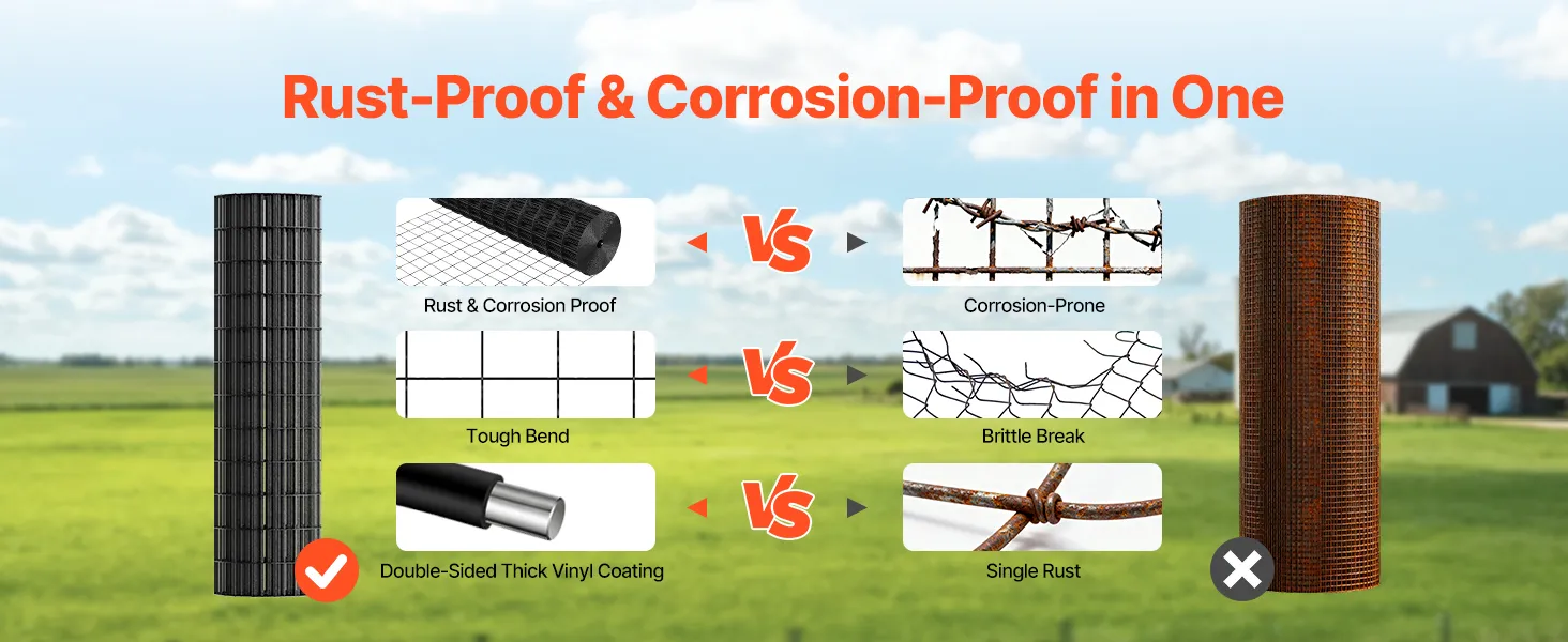 Premium Coating: Heavy-duty galvanized steel wire coated with quality black vinyl. The cattle fencing roll offers double rust protection and enhanced weather resistance, keeping the fence durable against sun and rain for long-lasting performance