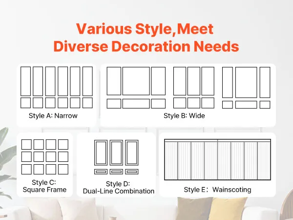 We offer a thoughtfully curated selection of wall moulding styles tailored to specific spaces: classic squares for living rooms, rectangles for hallways, and full wainscot layouts for dining rooms. Each wall molding panel is easy to paint or decorate for a personalized finish.