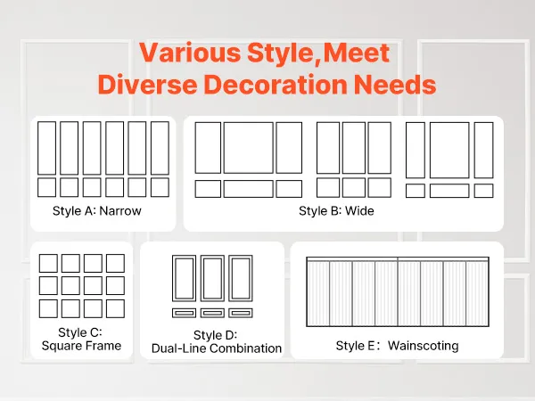 We offer a thoughtfully curated selection of wall moulding styles tailored to specific spaces: classic squares for living rooms, rectangles for hallways, and full wainscot layouts for dining rooms. Each wall molding panel is easy to paint or decorate for a personalized finish.