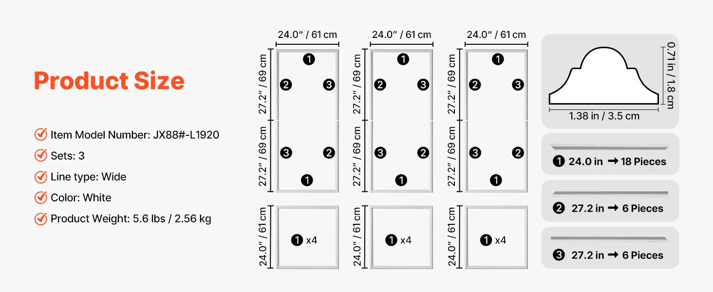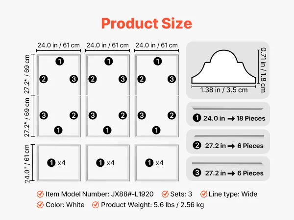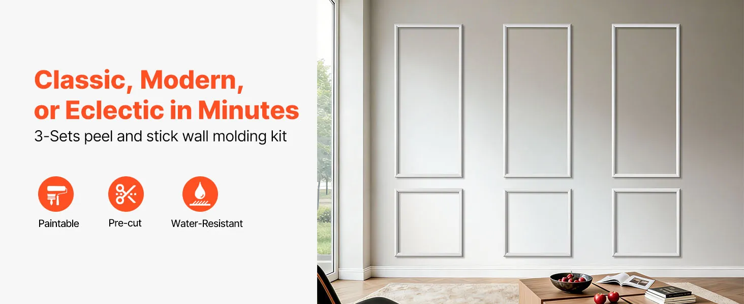 VEVOR Wall Molding 3 Pack, Wainscoting Panels Kit, Lightweight Paintable Polystyrene, Easy to Install, Waterproof Accent Wide Profile Trim for Interior Living Room, Bedroom,White (61x137 + 61x61 cm)