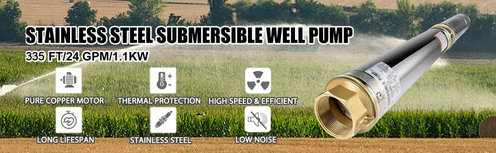 The submersible well pump's maxed flow is 24 GPM, and the highest head is 335 ft, providing you higher requirements of the pump. Steel impeller provides large flow up and lifts for you to get better pump's performance.