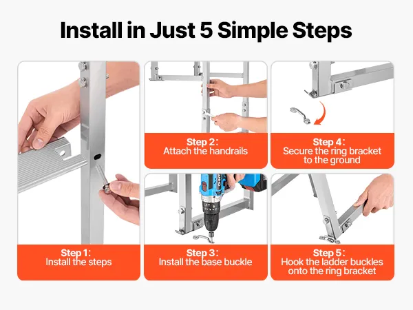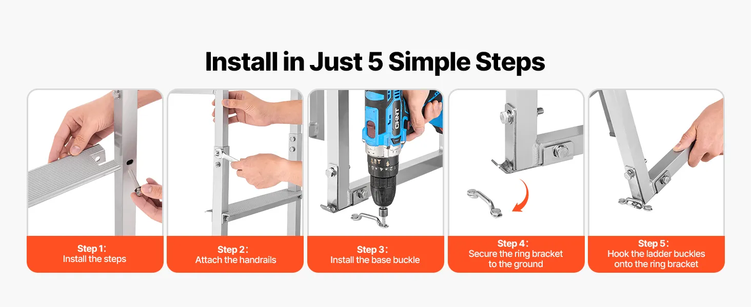 Q: Is the Dock ladder secure when only fixed with buckles? A: The dock ladder features an all-aluminum alloy structure with a strong weight capacity. The extended base bracket increases the contact area with the ground surface, providing stable support while maintaining stability and portability.