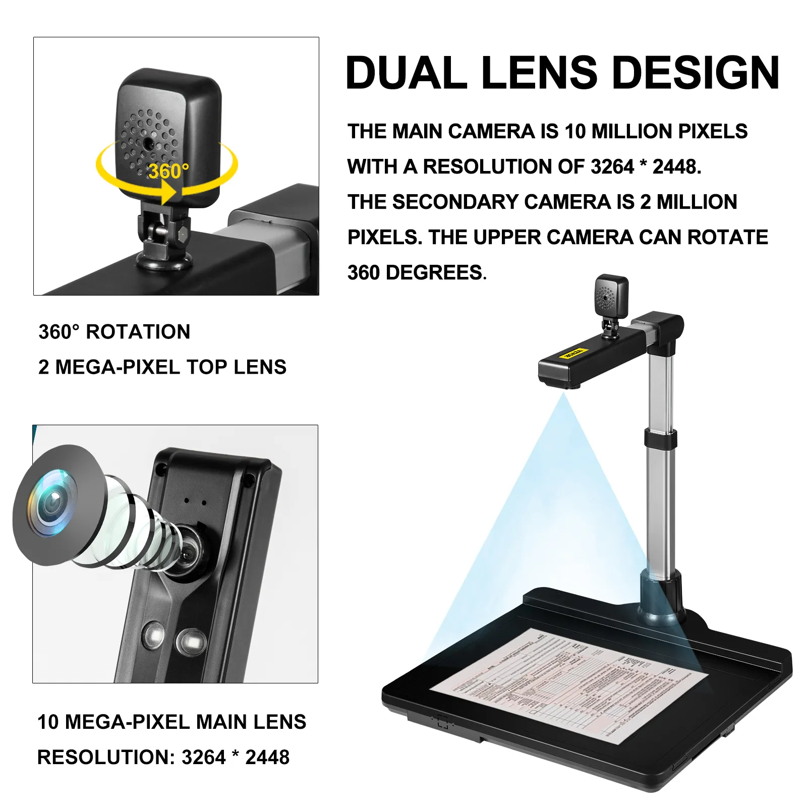 The doc camera features a dual-lens design, with a primary lens (10 mega-pixel) for documents or objects scanning and a top lens (2 mega-pixel) for portrait shooting and video recording.