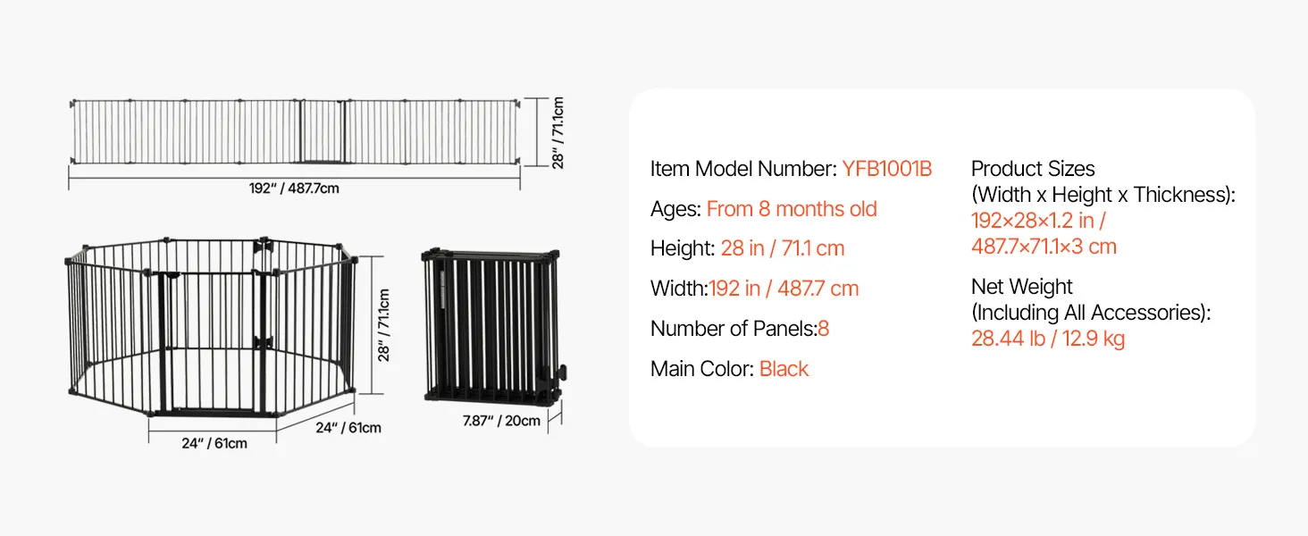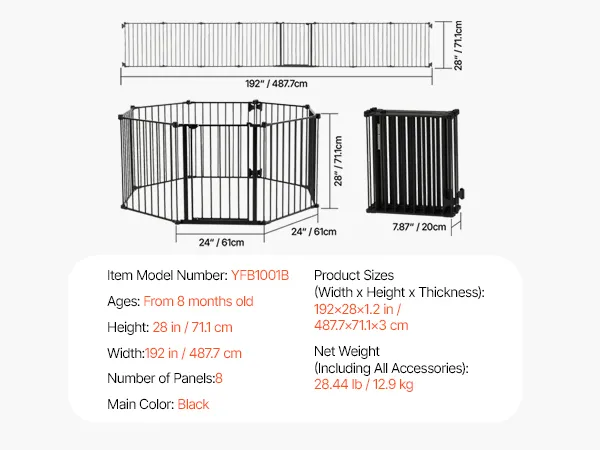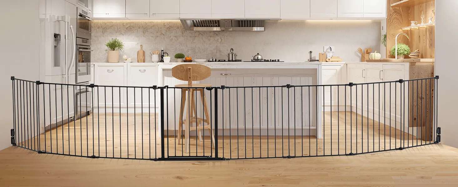 Extra Wide Baby Gate: With a maximum width of 192 in / 487.7 cm, this baby gate is ideal for larger spaces. Eight panels can be freely combined to create various widths and shapes, making it easy to adapt to any corner of your home. Whether it's a spacious living room or a narrower corner of a bedroom, it fits ideally