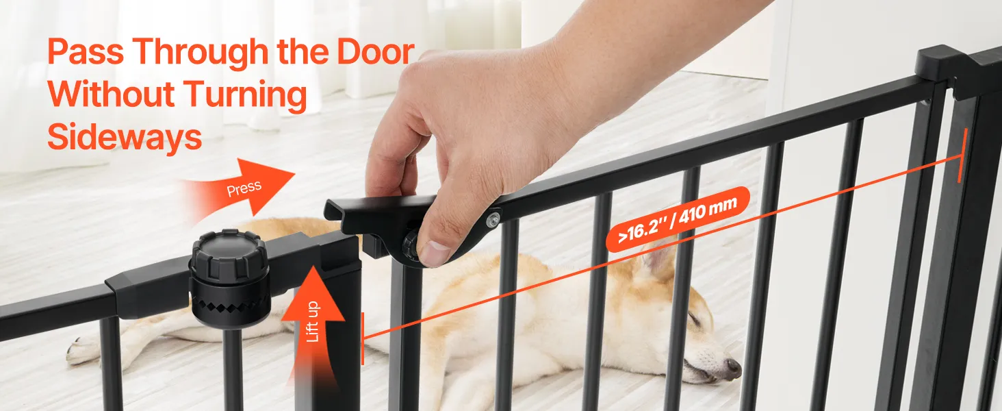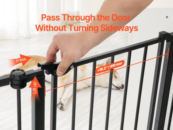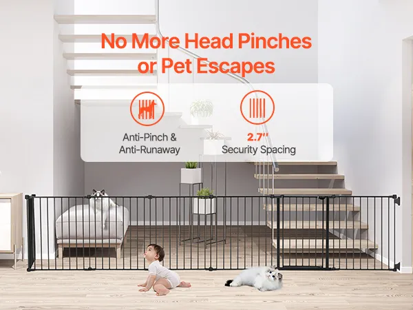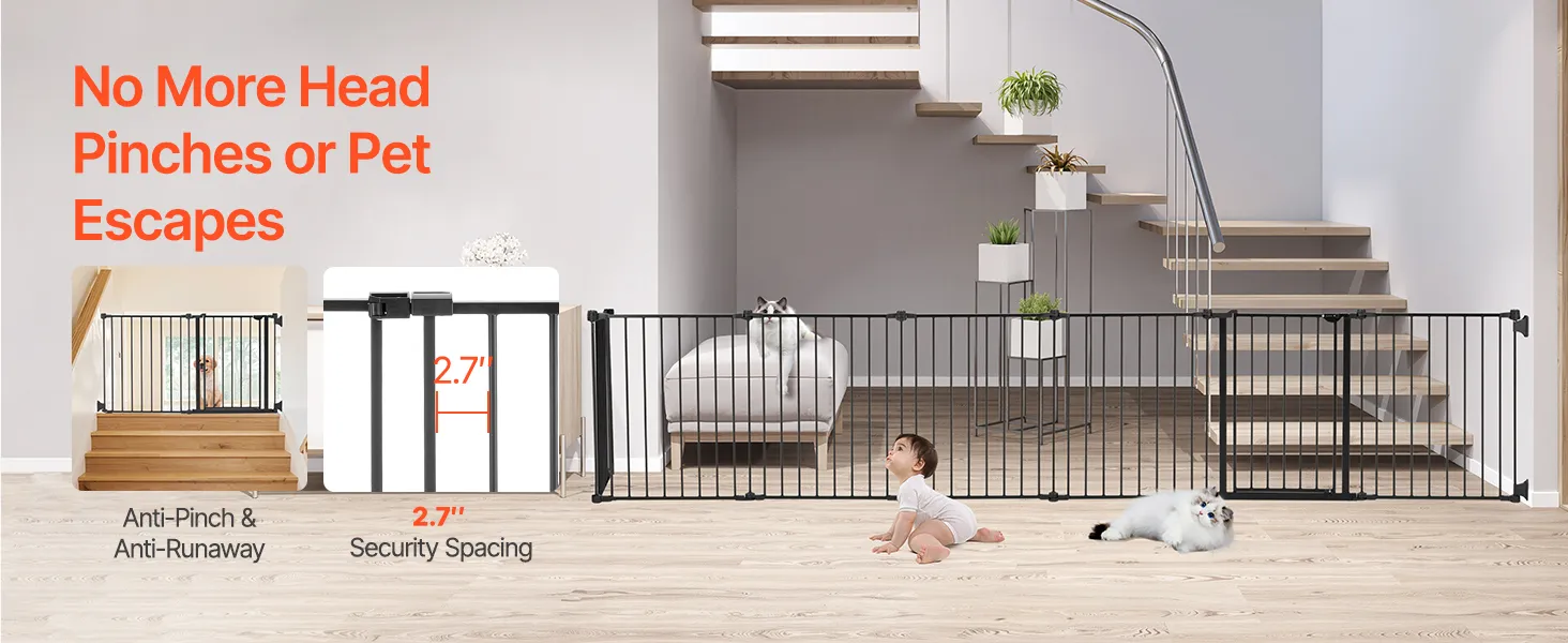Featuring 2.7 in ultra-narrow spacing, this dog gate effectively avoids babies from slipping their heads through the bars, reducing the risk of injury. It also prevents pets from squeezing through, ensuring the security of both children and animals.
