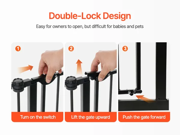 The unique double-lock mechanism is easy to operate but hard for babies to open, preventing them from accidentally unlocking the pet gate and entering dangerous areas when unsupervised.
