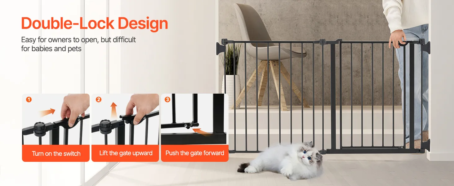 Security for Babies and Pets: Made from durable, high-quality steel, this pet gate features 2.7 in spaced bars to effectively avoid babies from getting their heads stuck and pets from slipping through. The innovative double-lock system ensures that both babies and pets can't open it, providing double protection for your little one's security