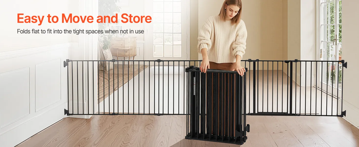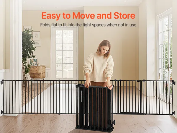 Easy to Fold: Once folded, the dog gate becomes compact and space-saving. It can be stored in a closet corner, under the bed, or in the trunk of your car with ease. The foldable design allows you to quickly adjust the fence for different settings and needs