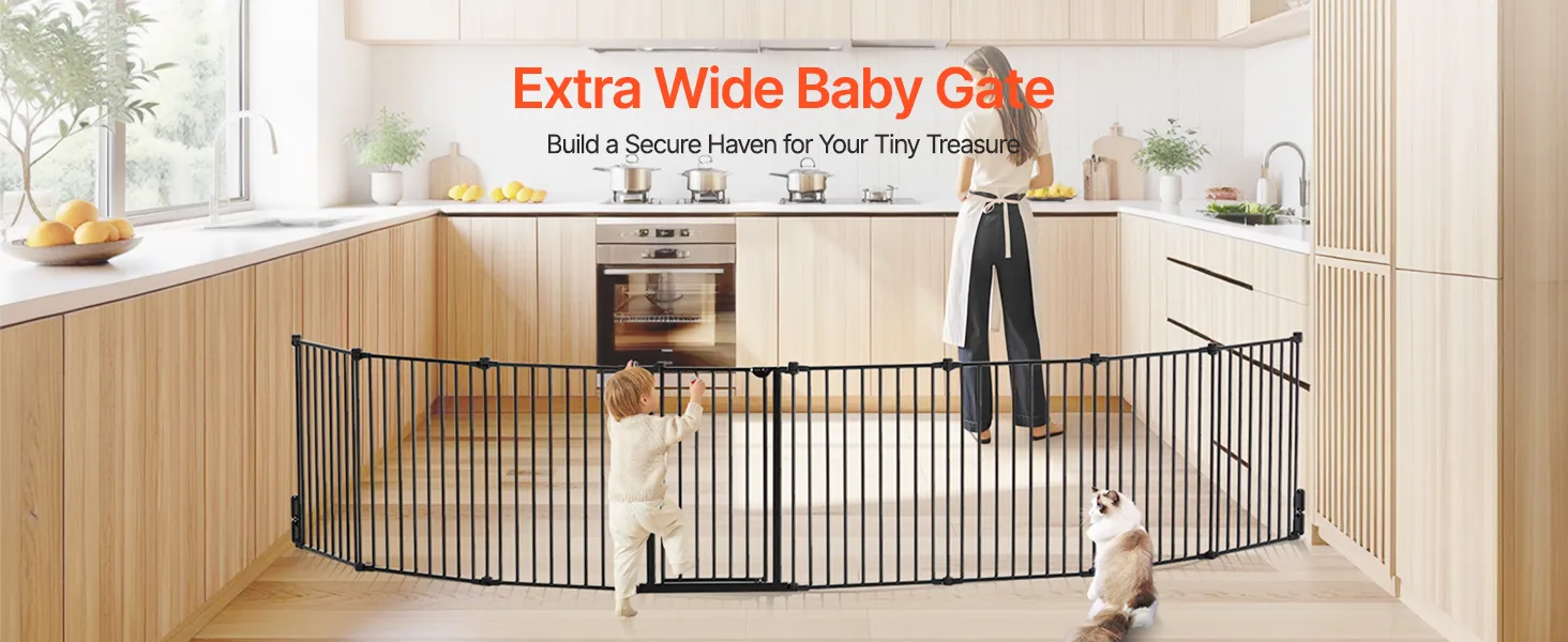 VEVOR Baby Gate, 192 Inches Extra Wide, 28 Inches High 8-Panel Foldable Dog Gate, for Child Pet Security, One-Hand Open, Install Between Two Walls or As a Fence, for Stairs and Doorways, Black