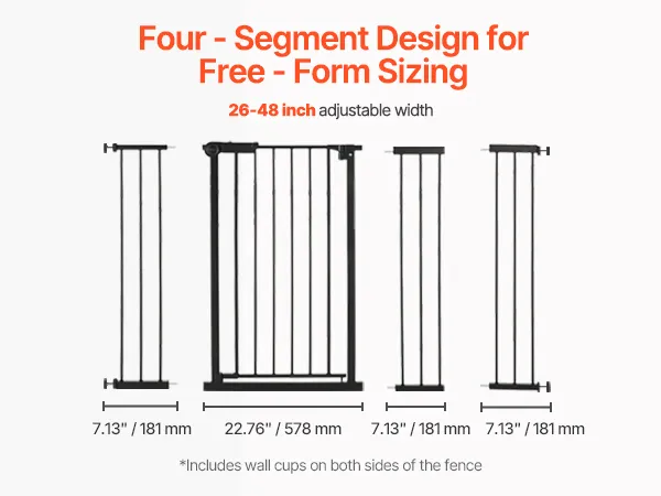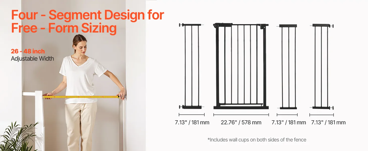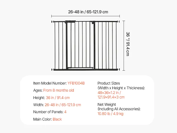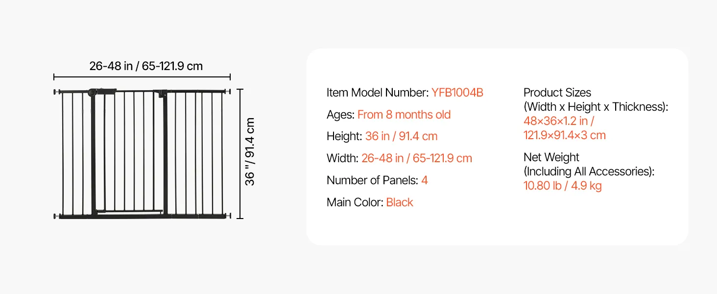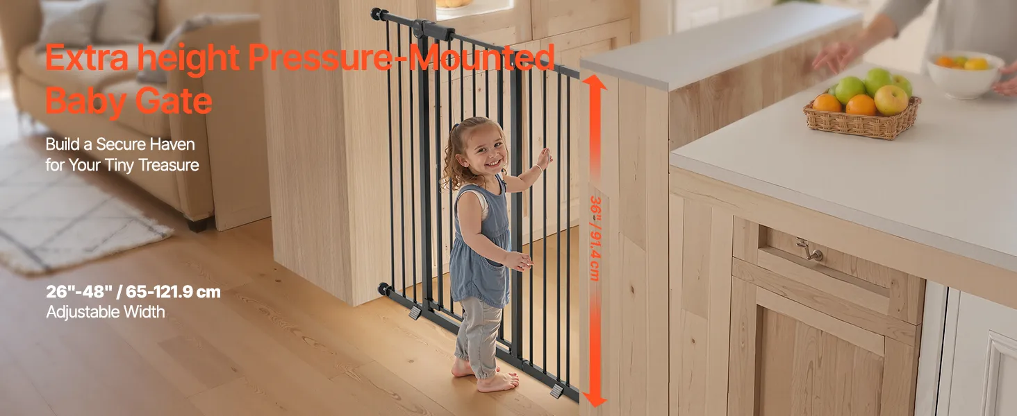 Tall Baby Gate: With a height of 36 in / 91.4 cm, you don't have to worry about pets jumping over the baby gate. It also features an adjustable width of 26-48 in / 65-121.9 cm, fitting various openings in your home. It is widely applicable to stairs, kitchens, hallways, bedrooms, and more