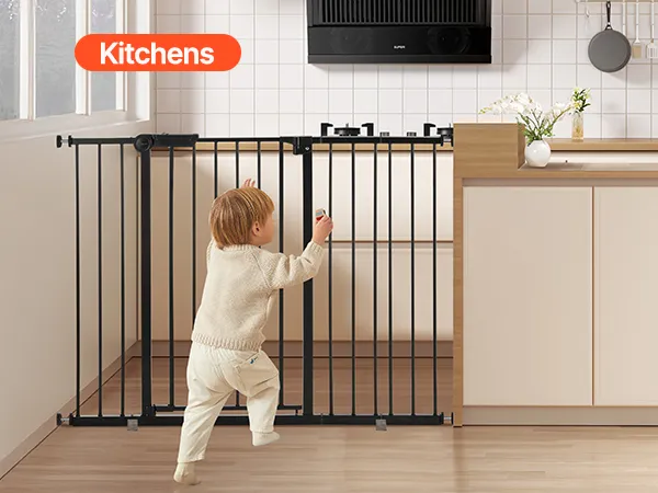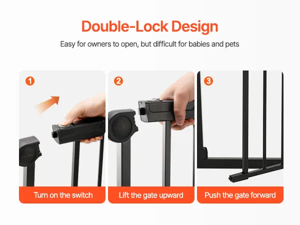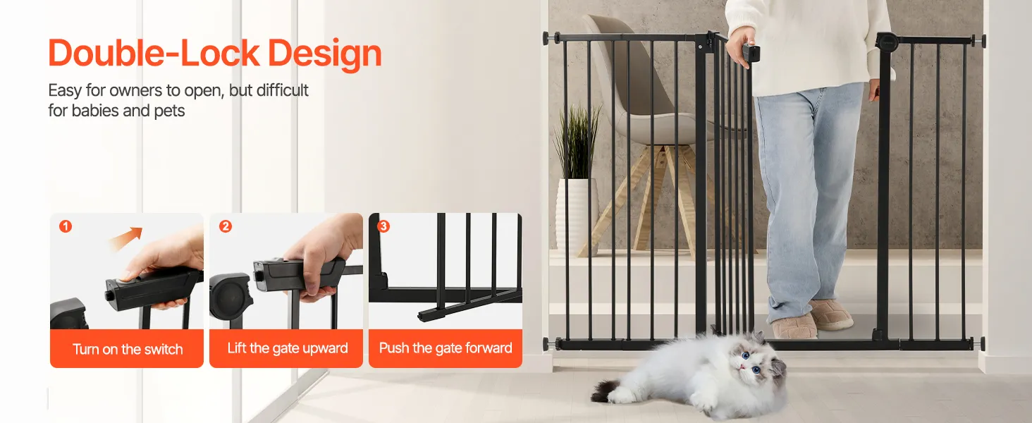 The unique dual-lock system is simple to operate yet difficult for babies to open, avoiding them from accidentally opening the pet gate and entering unsafe areas when unsupervised.