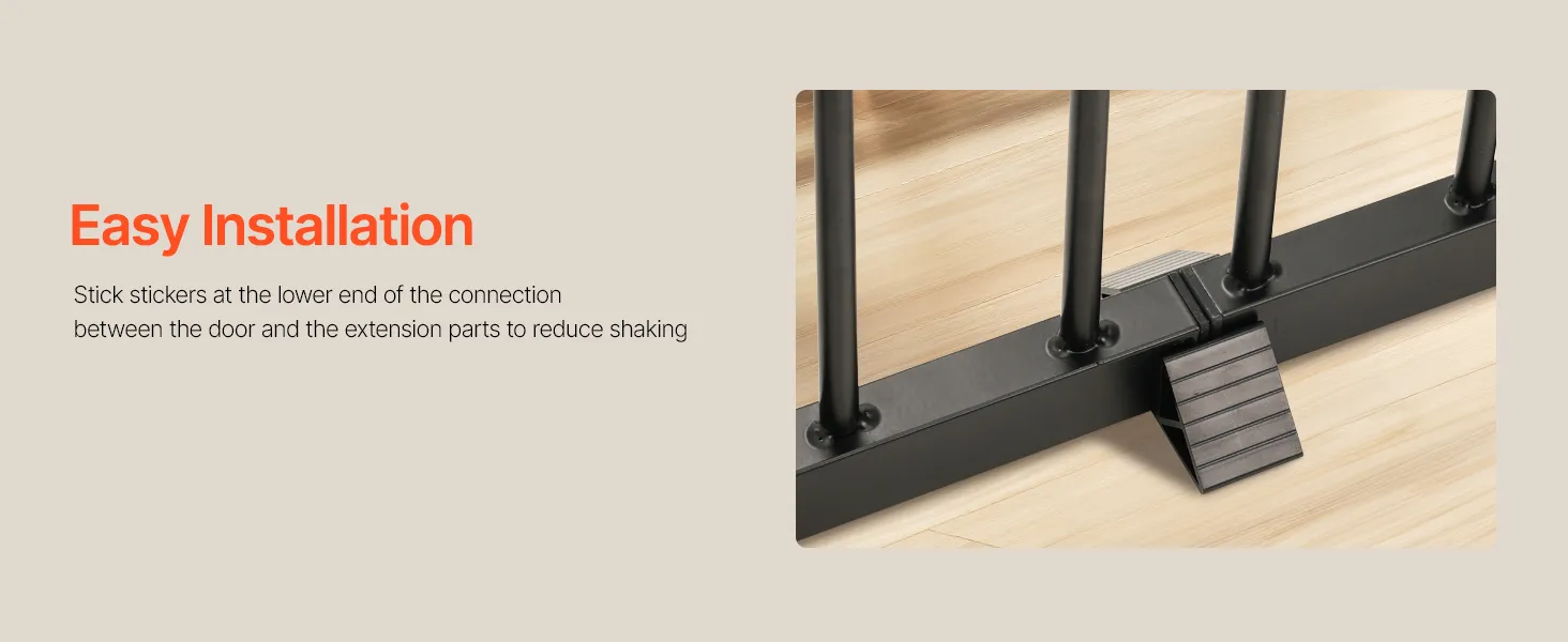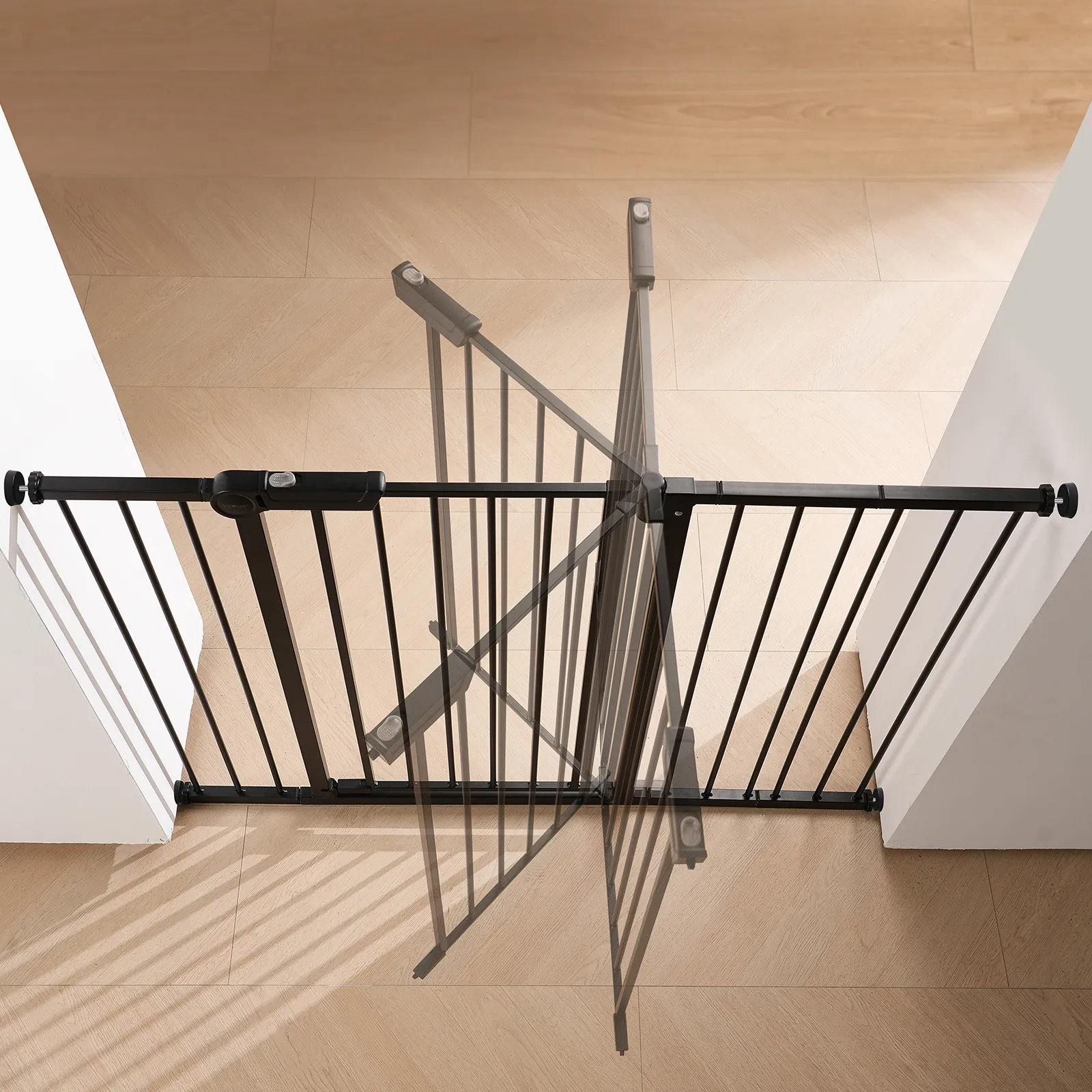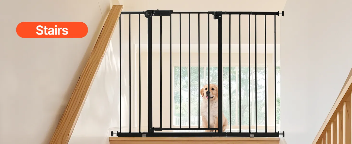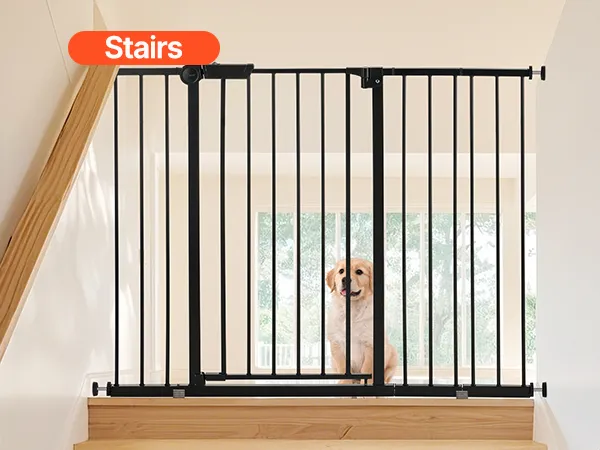 Security for Babies and Pets: Crafted from durable, high-quality steel, this baby gate for stairs features 2.5 in spaced bars to effectively avoid babies from getting their heads stuck and pets from slipping through. The innovative double-lock system ensures that both babies and pets can't open it, providing double protection for your little one's security