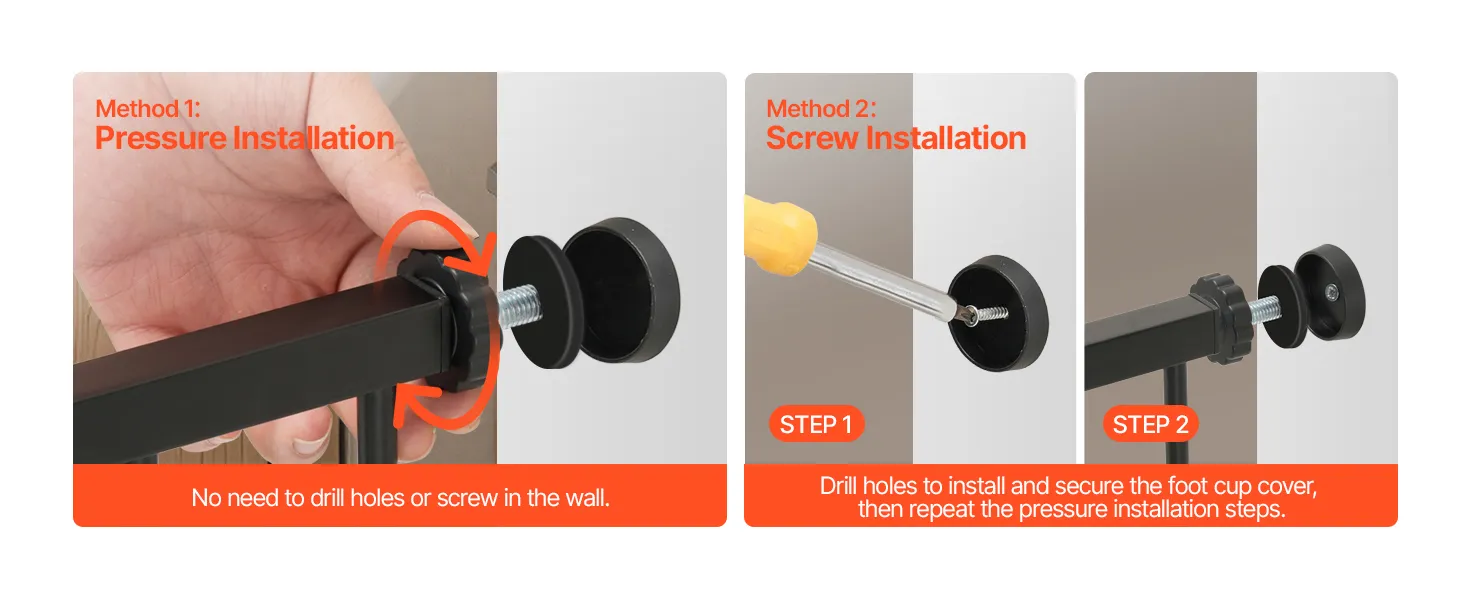 This baby gate features an innovative pressure-mount design that requires no drilling, nailing, or tools that could damage your walls during installation, keeping your walls intact. It creates a secure environment for your baby, ensuring security for your peace of mind!