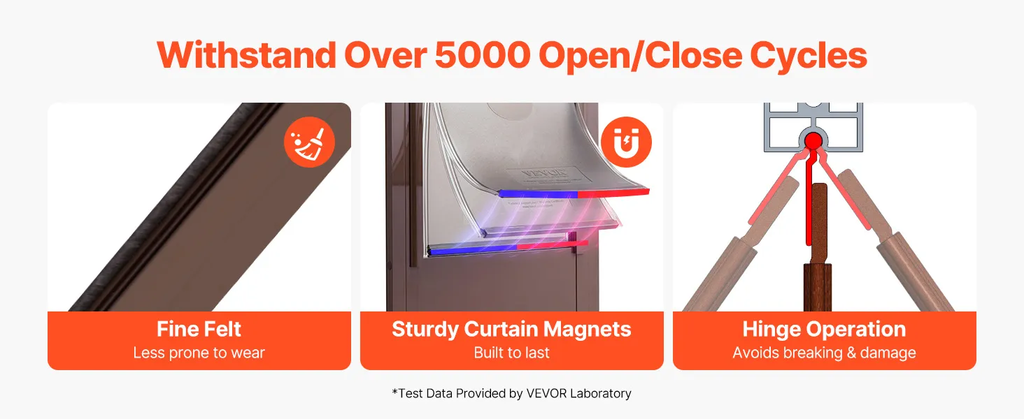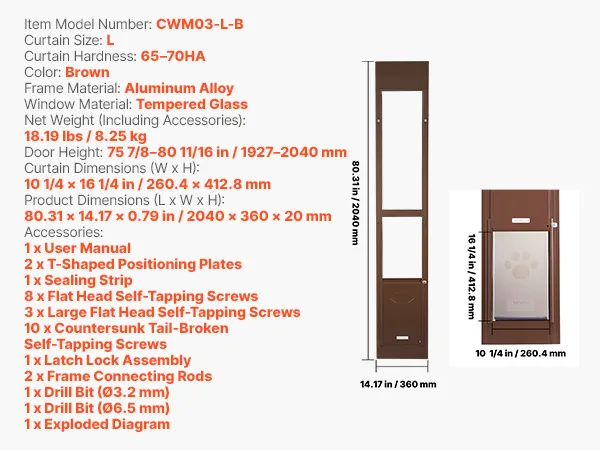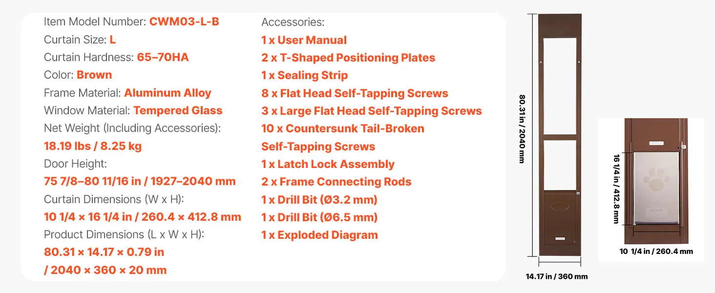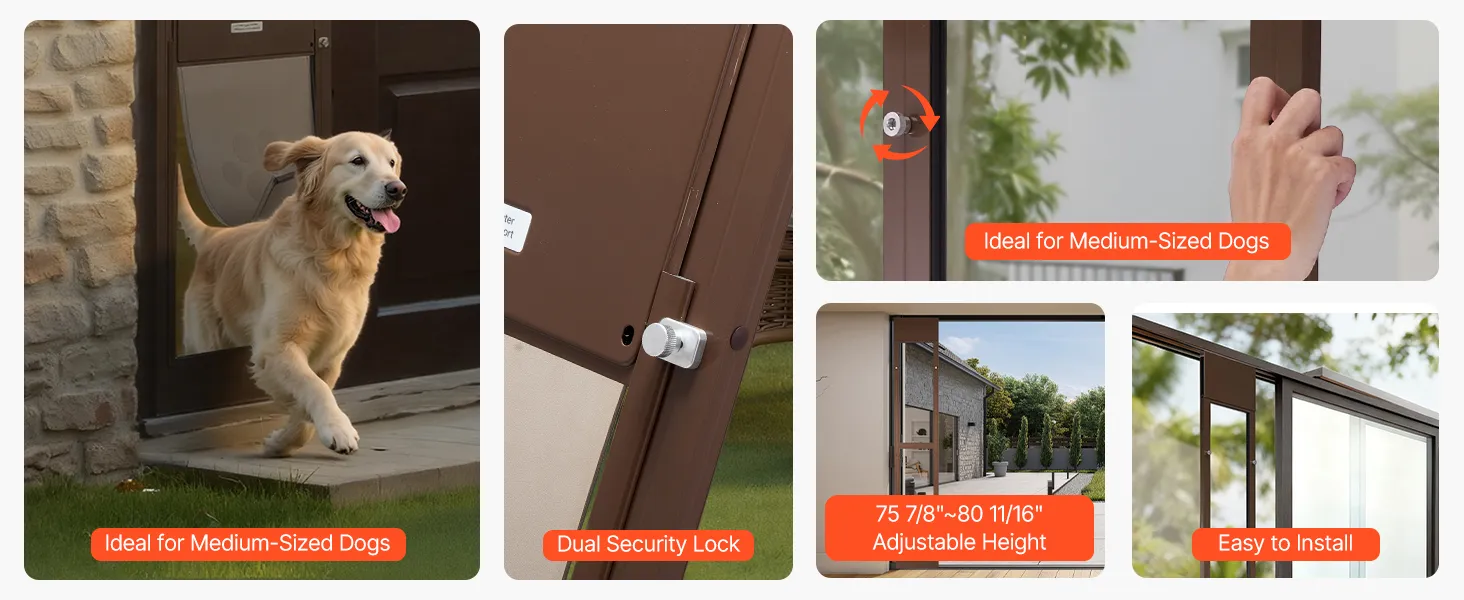 Adjustable Height: The doggie door for sliding glass door is height-adjustable from 75 7/8 to 80 11/16 in, fitting various door frame sizes. This feature simplifies the installation process,making it easy for both beginners and experienced users