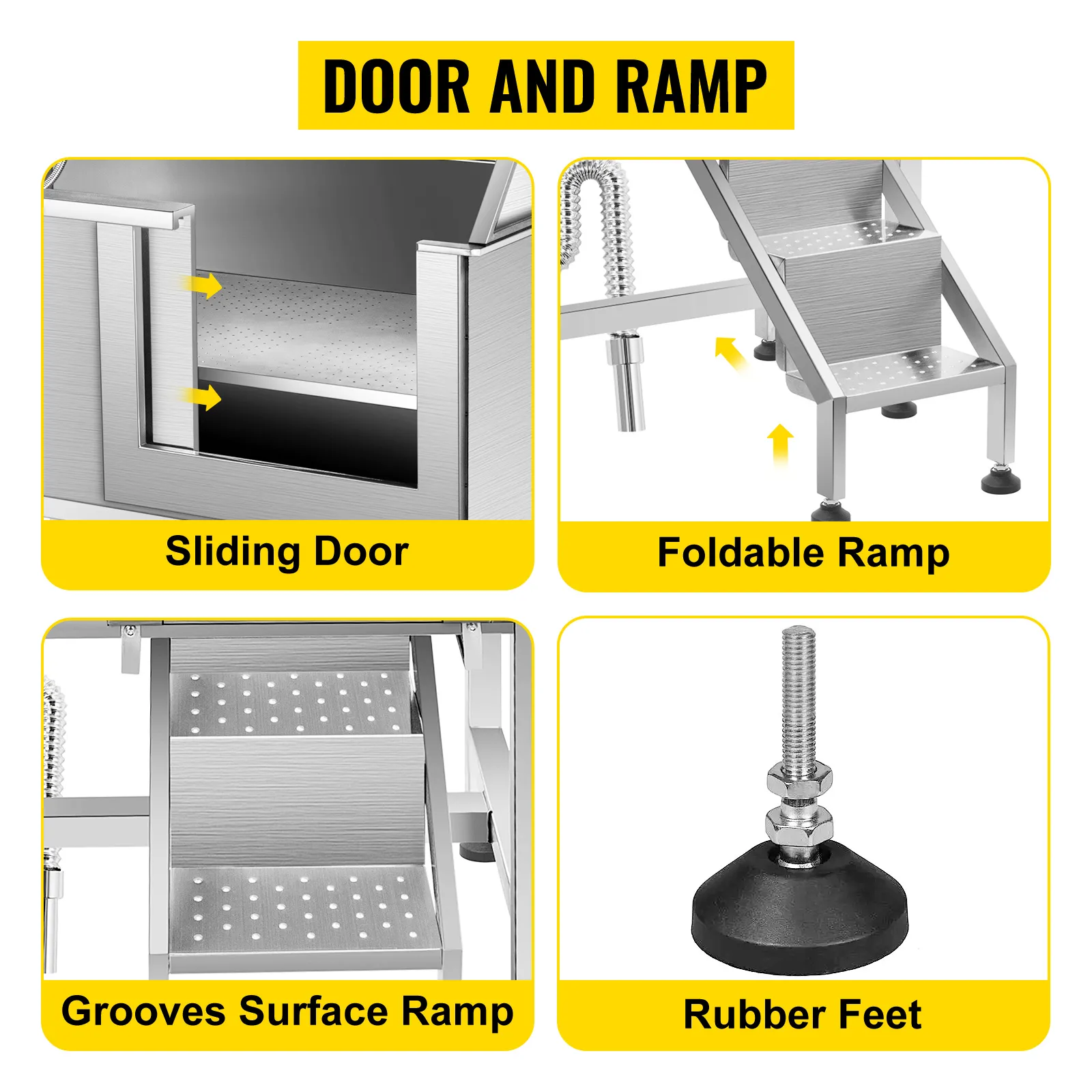 The sliding door is for smoothly open and close, the foldable ramp to easily store and move, the non-skid ramp to help pets climb in and out the tub, and the rubber feet to keep stable.